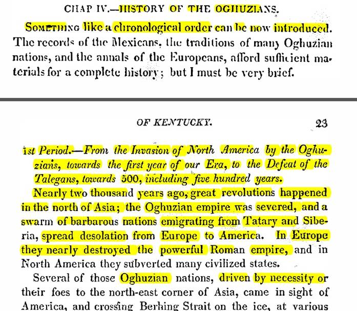 Prof. C. S. RAFINESQUE, AM, Ph. D., talks about them in his book entitled “Ancient History, or Annals of Kentucky, 1824” (With a Survey of Ancient Monuments of North America and a Tabular View of the Principal Languages and Primitive Nations of the Whole Earth) pages 23-25. He reports the presence of OGUZIANS in North America since some 2000 years ago. The so-called LENAPE people were ancient TuranianTur/Turk/Oguz people, like many other North American Natives were! They had a common language which bound them to each other as Turanians.